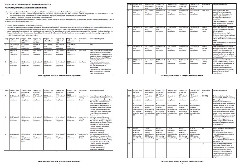 - Stages 11 & 12 of Behaviour for Learning are there if required.