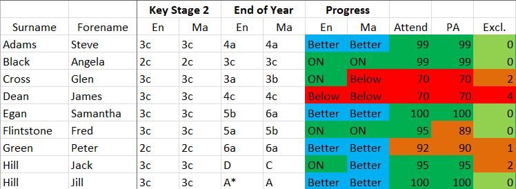A students’ academic progress is RAG rated automatically by the spreadsheet:
