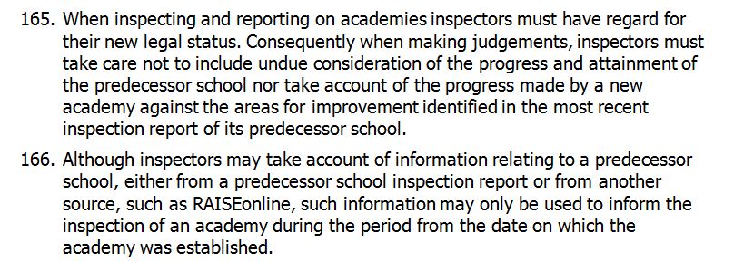 - Less emphasis on the previous three years of data particularly where a school has become and academy – the distinction between a converter and sponsored academy seems to have been removed.