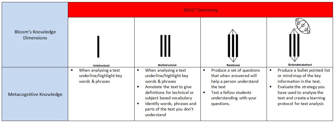 Here’s an example of using SOLO with one of Bloom’s Knowledge dimensions, I’ve deliberately chosen to focus on the metacognitive dimension as this is the one found least often in most lessons: