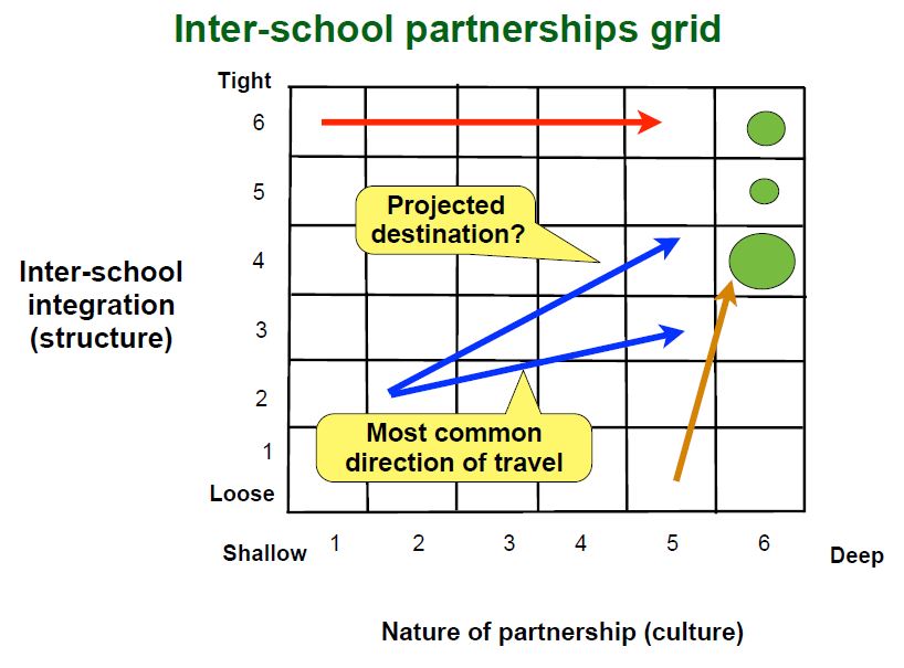 The graphic below looks at the depth of a partnership (shallow to deep) and the structure.  At the loose end it is a simple co-operative arrangement with no formal ties and at the tight end of the continuum this would be a formal governance or contractual agreement – multi-academy trusts, hard federations or academy chains.