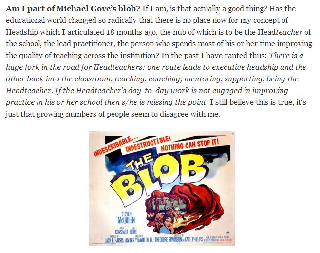 We need Executive Headteachers who are part of the system and building professional capital across a local family of schools but are not involved in the day to day running of any individual school. We also need Headteachers who are making sure an individual school is the best it can possibly be for the students who attend it. They are very different roles. Separating them out I hope will make each sustainable and give the best of both Worlds. This requires a very different co-operative style of leadership and thinking to replace the competitive “my school” approach of the last twenty five years.