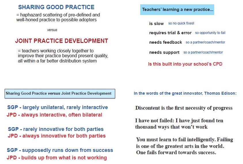 Maybe part of the answer is in the way we are designing professional development in our schools. The number of people prepared to give up a bank holiday Saturday to attend ResearchEd in York, who blog out their thoughts in their own time or go to TeachMeets is quite inspiring. David Hargreaves slides on the benefits of Joint Practice Development as opposed to Sharing Good Practice may well help show the way ahead. Is Joint Practice Development maybe at the heart of Disciplined Innovation, that midway point between Jerusalem & Babylon?