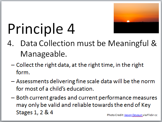 If I added another principle it would be that assessment must support learning across the end of a year, key stage and phase.  The latter is of particular interest to the Trust.