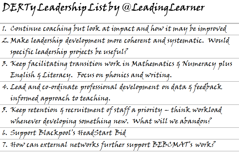 This post has actually been on the drawing board for a couple of months (originally titled “Built a School Now to Build a Culture”) but it was Tom Sherrington’s (@headguruteacher) brilliant post last week, about his plans to improve his teaching in the next academic year, which led to a format rethink. I first used the term DERT (Dedicated Evaluation & Reflection Time), an adaptation of DIRT (Dedicated or Directed Improvement & Reflection Time), in a post last November of Growth Mindset. It was associated with developing teaching but equally applies to improving your leadership.