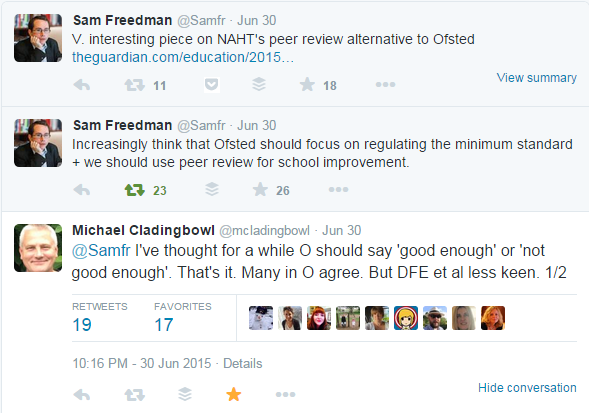 Clearly I’m getting rattled as I can’t even spell “school” in the tweet below, though Mrs LL was getting fed up of me being on my phone and this silly predictive text thing on my mobile causes no end of problems.  My view has been for a long time that schools are more likely to improve in a low stakes peer review process as long as progress outcomes show no major and sustained concerns.  The short inspection process, which if things go well, with its no grading approach has a lot to commend it particularly if it was led by the profession with training and moderation by HMI, in the first instance.