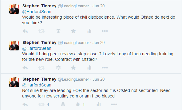 Polite non-violent legal civil disobedience has its place in a democratic society to help bring about desirable change.  All schools receiving a narrative only report, no grades, and moving towards validated peer review seem desirable to me.  It’s clear myself and Sean don’t see eye to eye on the issue of Ofsted inspectors being part of the school system.  I see them as an external do to rather than an internal, to the system, do with.  The answer to my final question above looks like a no.  The scrutiny committees will apparently only consist of two people, an HMI and someone other than me.  At least I offered to help Ofsted on this occasion.