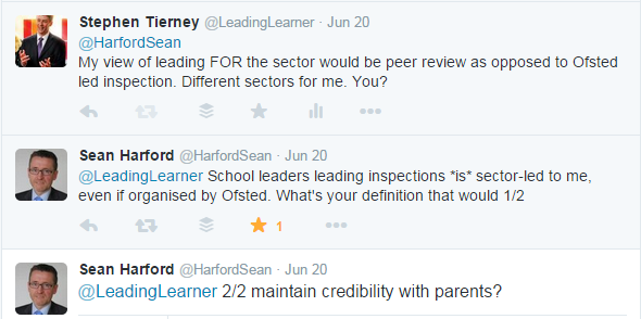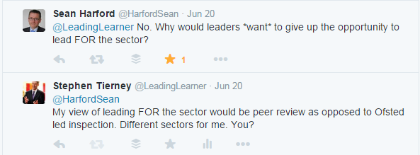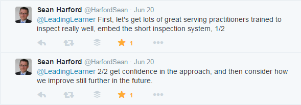 All credit to Sean and before him Mike Cladingbowl for engaging with people both face to face and via social media.  They are Ofsted’s more acceptable face.  Sadly the behaviour of some inspectors and HMI can, on occasion, leave a lot to be desired and the lack of independence of the Scrutiny Committees is an ongoing cause for concern.