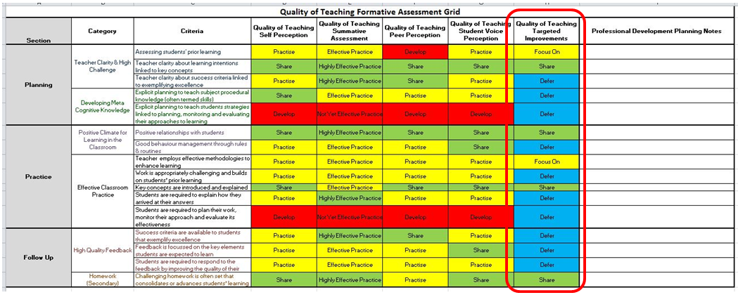 Each element of the formative process gives a perspective. It is important to find the overarching narrative provided by the feedback rather than looking at a single element to the exclusion of others. The final part of the process is for the teacher supported by her/his mentor to identify the area(s) of teaching s/he wishes to focus on. It is perfectly reasonable for a teacher to focus on one area and it may be possible to focus on a second one at the same time. However, attempting to focus on more than this is unrealistic and may well actually damage or limit the development of the quality of teaching. Most areas are “deferred”. This means, the area is not one of my super strengths and I will work on it in the future but not this year. This will allow me to focus my efforts on effectively improving my chosen area(s).