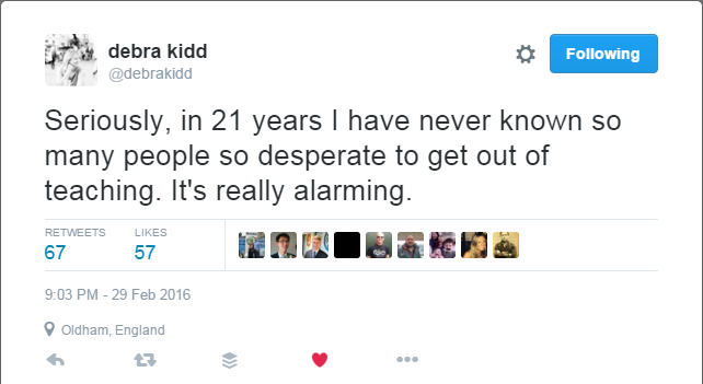 Twitter can be a petulant argumentative teenage at times but there seems to be a sea change in tweets relating to retention and recruitment of staff.  The example below is one from Debra Kidd who brings a sane and sensible perspective to twitter proceedings: