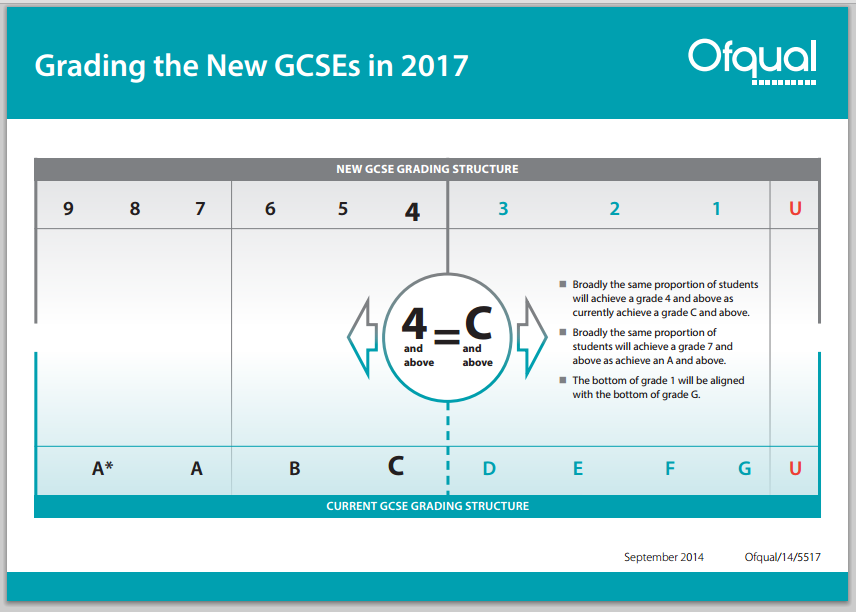 As the new GCSE 1-9 grading system is introduced, with Grade 9 being high, the pass grade is considered to be 5.  This equates to the top end of the current grade C.  Percentage pass rates based on the new grade 5 are likely to drop about 20% and possibly a bit more for the combined Percentage passing English & Mathematics from 2017 onwards.  It’s worth realising that the EBacc pass rate will also plummet in 2017 and then further in 2018 as the EBacc subjects also move to the 1-9 scale.