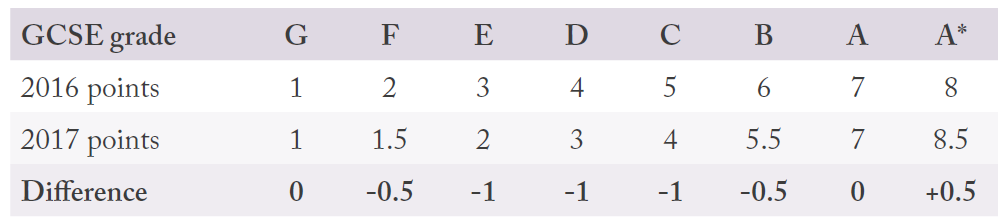 During the changeover phase from letters to numbers, the table below shows the numerical value of each grade.  High attaining students, and schools who have many of these pupils in, could see point scores rise with the converse true for middle and lower attaining pupils.
