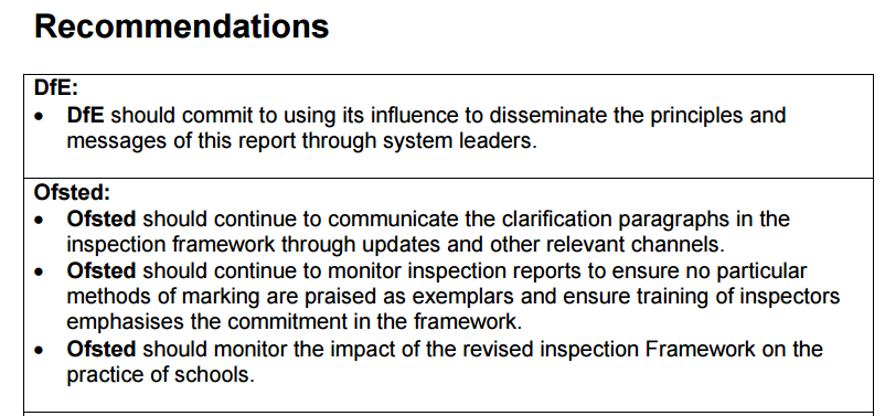 “Our starting point is that marking – providing written feedback on pupils’ work – has become disproportionately valued by schools and has become unnecessarily burdensome for teachers. There are a number of reasons for this, including the impact of Government policy, what has been promoted by Ofsted, and decisions taken by school leaders and teachers.”