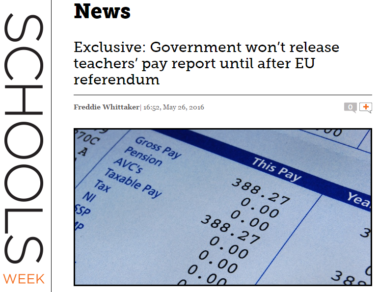 In an exclusive story Schools Week revealed that a “key report from the body which recommends teachers’ pay will not be published until after the EU referendum, despite having been sent to government almost a month ago.” What a great excuse for a bit of speculation; has the one percent ceiling for teacher pay been breached or is the report damning about teacher supply? Fat chance of the first; it’s the latter for me.