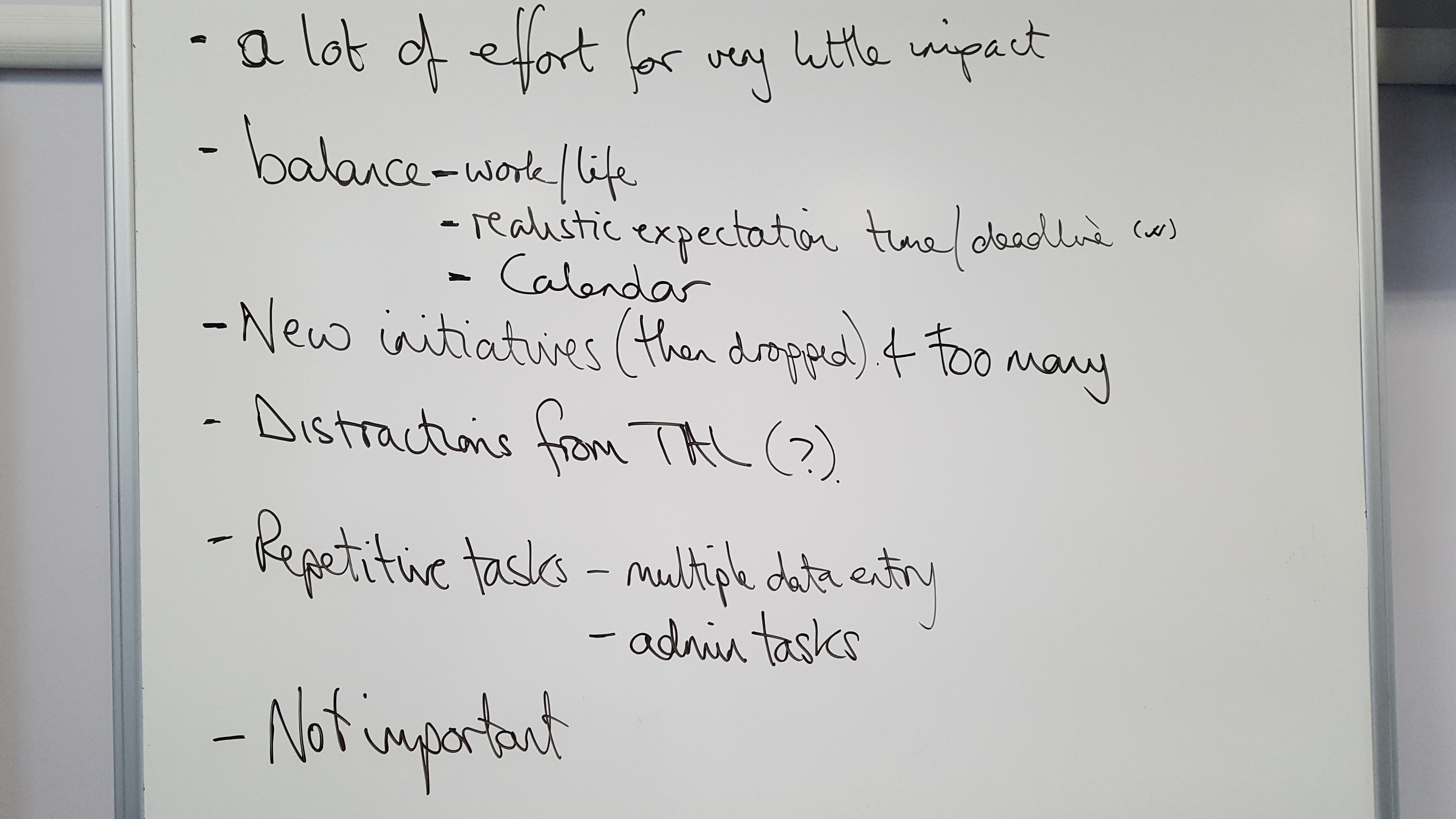 Having defined what we meant by workload (it means different things to different people) I fell back on an old favourite of a process. Write as many workload issues as you think there are onto a sticky note, one per note. This allows everyone to have a say, no one or two voices monopolise and all the issues are outed. Gather all the notes together and start grouping similar ones; allow people to discuss the main issues so we understand the problem that we need to address. Give everyone five sticky red dots to distribute how they like on the workload issues they consider most important; five on one issue or one on five different issues or somewhere in between. If you are leading the meeting you don’t get any sticky red dots. It’s an opportunity to listen; more power to the people.