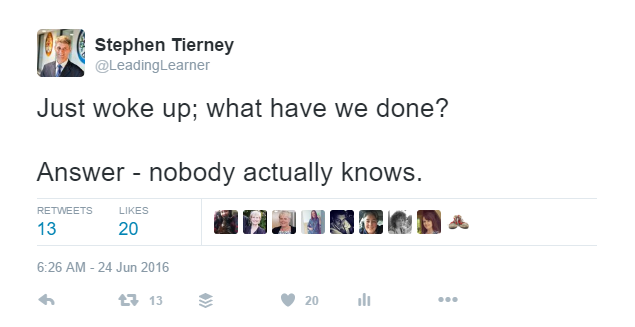 Today felt like the exact opposite of the 2nd May 1997 when there was an almost euphoric feeling. A young Tony Blair walked into number 10 Downing Street and the promise of “Education, Education, Education”. I had simply not contemplated that we would really leave Europe. My whole adult life has been spent inside the European Union, including all its imperfections, with a continual background protest noise about leaving. When Johnson & Gove eventually appeared in front of the media they looked almost shell shocked; it’s one thing campaigning to Leave but another thing totally to rewrite the constitutional and political map of the United Kingdom. Scotland understandable now wants another independence referendum that may see them leave the United Kingdom. Sinn Fein is agitating for Northern Ireland to stay in Europe as part of Eire; a long term political goal and this is an opportunity to further their cause.