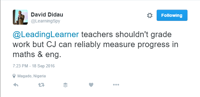 This is pretty much the discussion I was trying to have with new DH on Thursday. But how does a lowly class teacher (in spite of the Master’s in Assessment) counter the culture of tracking whole pupils through some kind of aggregated score? This still pervades everything: the need to believe that we can know how much progress a pupils is making, overall, in some kind of numerical value, across the whole of primary school and beyond.