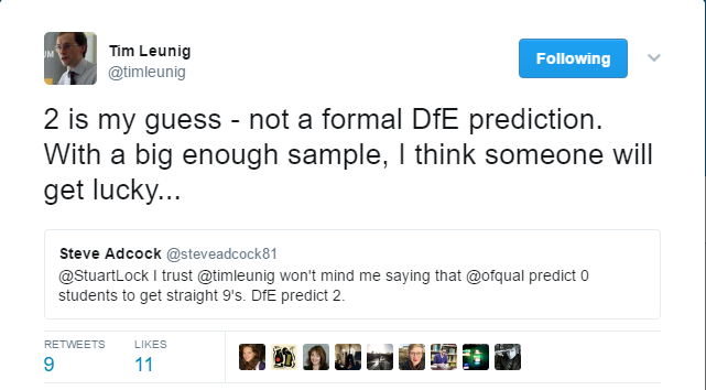 That is apparently 0-2 nationally not per school. So few students will actually achieve a grade 9; whilst happy to fully support aspiration, there comes a point at which you have to question what the value of the extra grade is. What can it actually be used for? Bragging rights isn’t really a good enough reason to design a national system around.