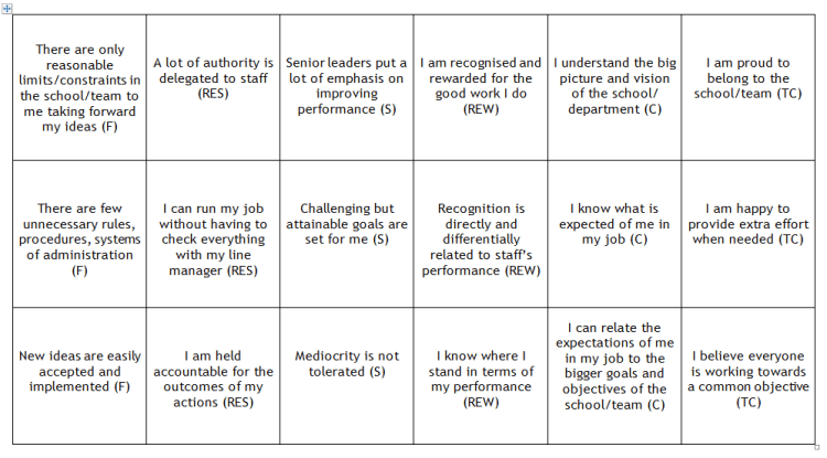 Take the eighteen statements and put them in one of two piles; agree and disagree.  I always suggest that people don’t over think their response; what’s your gut feel?  This whole exercise comes with a bit of a health warning; there isn’t a reliability measure.  However, it can identify some interesting lines of inquiry.  Any conclusions drawn need to take into account your own/others perceptions; be tentative with what you infer.