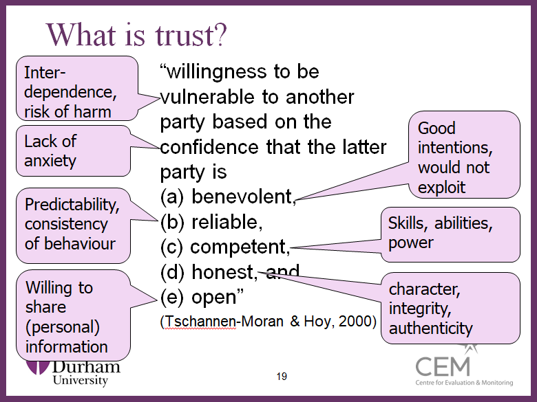 In the presentation I’ve used a couple of slides from a recent talk by Professor Rob Coe; the one on trust is particularly powerful. Schools have to create cultures of trust in which people are willing to share their vulnerability and professional weaknesses in order to improve. Too many schools have macho accountability cultures which create a sense of fear and a tendency to hide areas for development rather than a culture in which teachers proactively seek to address them.