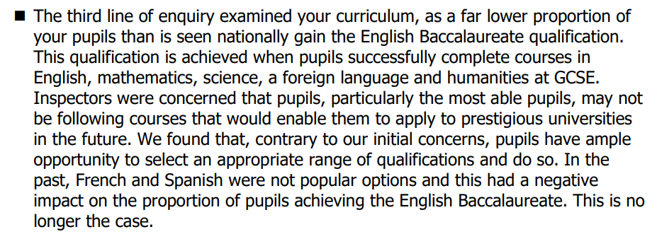 The third sentence is the real worry; remember it has been quality assured by Ofsted, “pupils, particularly the most able pupils, may not be following courses that would enable them to apply to the most prestigious universities in the future.” We now have a causal link created between the E-Bacc and attending a “prestigious” university. I know of no evidence that links the E-Bacc to attending prestigious universities. Cambridge stated they were not interested in the E-Bacc as an entry qualification; Oxford stated they’d give schools six years notice if they ever decided that the E-Bacc became an entry requirement for them. Similarly, I know of no other university that requires the GCSE E-Bacc; it’s two or more of a student’s A-levels being from the list of facilitating subjects that matters. It’s a side point but the bullet point appears overly negative given the final conclusions.