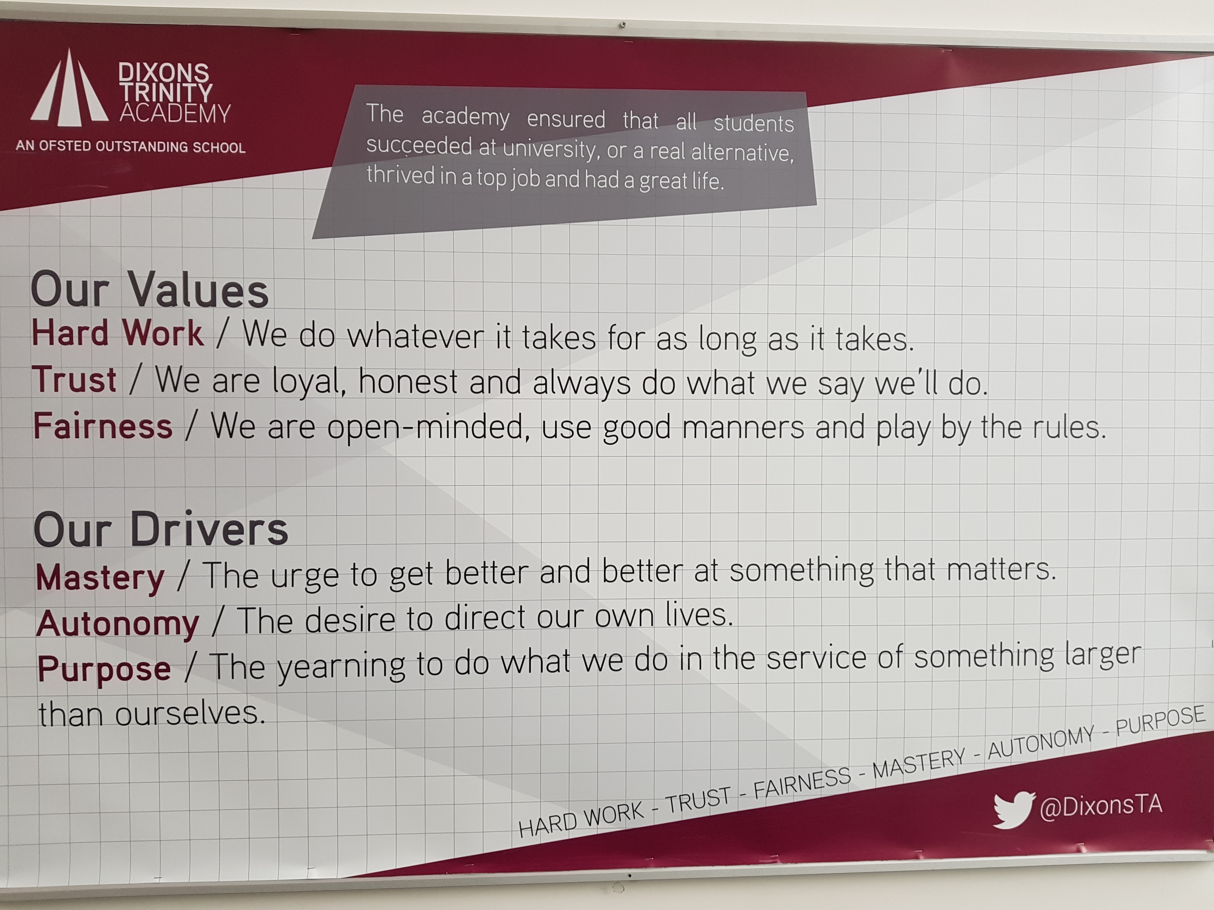 This was part of the endearing culture at Dixons. If something was going awry Luke was not afraid to stop the school and revisit what was expected, why it was important and how it would be achieved. The school has scripted in real detail the important parts of school life and then strives for consistently high implementation. There is a lesson for us all in this; first, decide what is important and what is not. Concentrate on collectively and collaboratively implementing the former and leave the latter to people’s good judgement, common sense and professionalism. This collaboration included with students and between students. It went far beyond compliance to a collective and individual commitment to succeed.