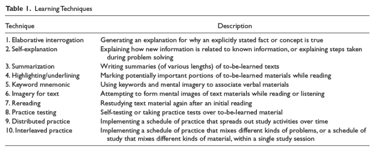 The paper provides a review of the ten learning techniques; each one is set out using the same format: a description of the technique and why it is expected to improve student learning; an exploration of its “generalizability” in different contexts; links to any research and any identified issues with implementation.