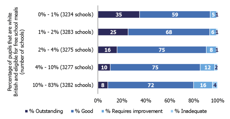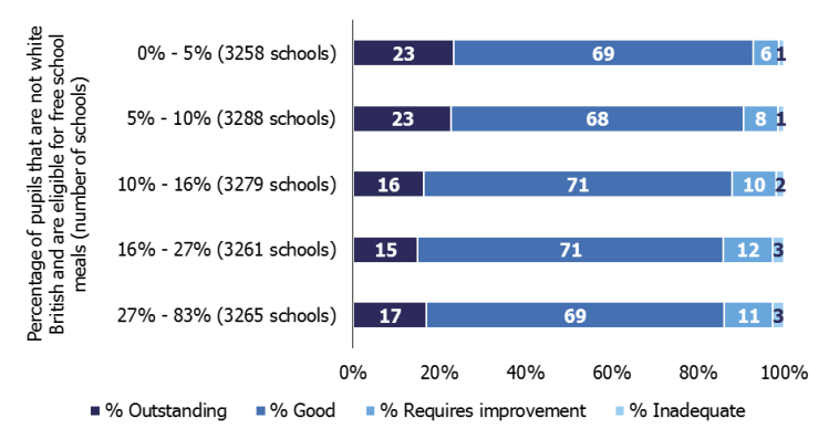 - Step 5 – For each band the proportion of schools judged outstanding/good/requires improvement/inadequate were calculated. Two sets of charts were then produced for each phase, showing the grades by the % of pupils that were white British and FSM, and by the % of pupils that were from another ethnic group and FSM. Each school was included on each chart for that phase – the charts are not mutually exclusive as each school appears on both. 3,158 schools were included in each of the two secondary school charts, and 16,351 schools are included in each of the primary school charts.