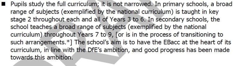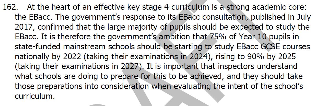 Ofsted’s great colon also reveals a yawning gap. It requires us to ask some serious questions; not least where all the modern foreign language teachers and increasingly the Science, Maths, History, Geography, Computing Science and English teachers are to deliver the EBacc, equitably across all schools. Schools in disadvantaged areas, on average find it harder to recruit and retain teachers of EBacc subjects. They are doubly disadvantaged by this proposed framework. It requires us to challenge the inspectorate’s limited and simplistic connection between “the heart of an effective key stage 4 curriculum is a strong academic core” and the EBacc, which is merely one example of an academic core curriculum. There are many other perfectly reasonable examples of a core academic curriculum; they differ in terms of the number of subjects that constitute the core and which subjects they contained but are no less valid or appropriate for pupils.
