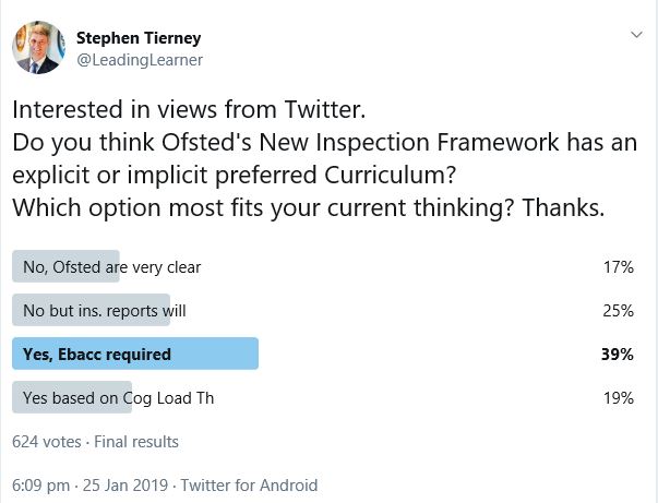 A fairly unreliable twitter poll, with 624 responses conducted last weekend, confirms the increasing lack of confidence in Ofsted’s statement; simply repeating something “Ofsted has no preferred curriculum” or “strong and stable leadership” doesn’t makes it true or believable.