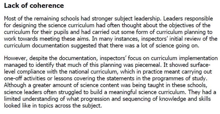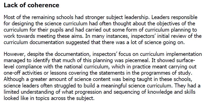 The title comments on the “lack of coherence”. In curriculum terms coherence has a specific meaning – explicit connections and links are made between the different subjects/experiences encountered. The important giveaways that this is not about coherence are that the passage refers to building “a meaningful science curriculum” and then “a limited understanding of what progression and sequencing of knowledge and skills looked like in topics across the subject”.