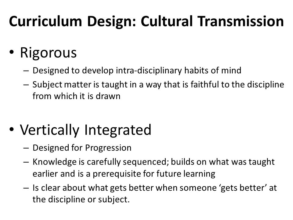 The seven principles of good curriculum design (Wiliams, 2013) are again held in tension with decisions needed about what should be of greater importance in designing the curriculum (more in this blog). The slide below is my view that cultural transmission leads to a predominance of the principles of rigour and vertical integration. It can also lead to a greater focus within the curriculum – teaching of key ideas/concepts – though our current content heavy GCSE specifications would need slimming for that.