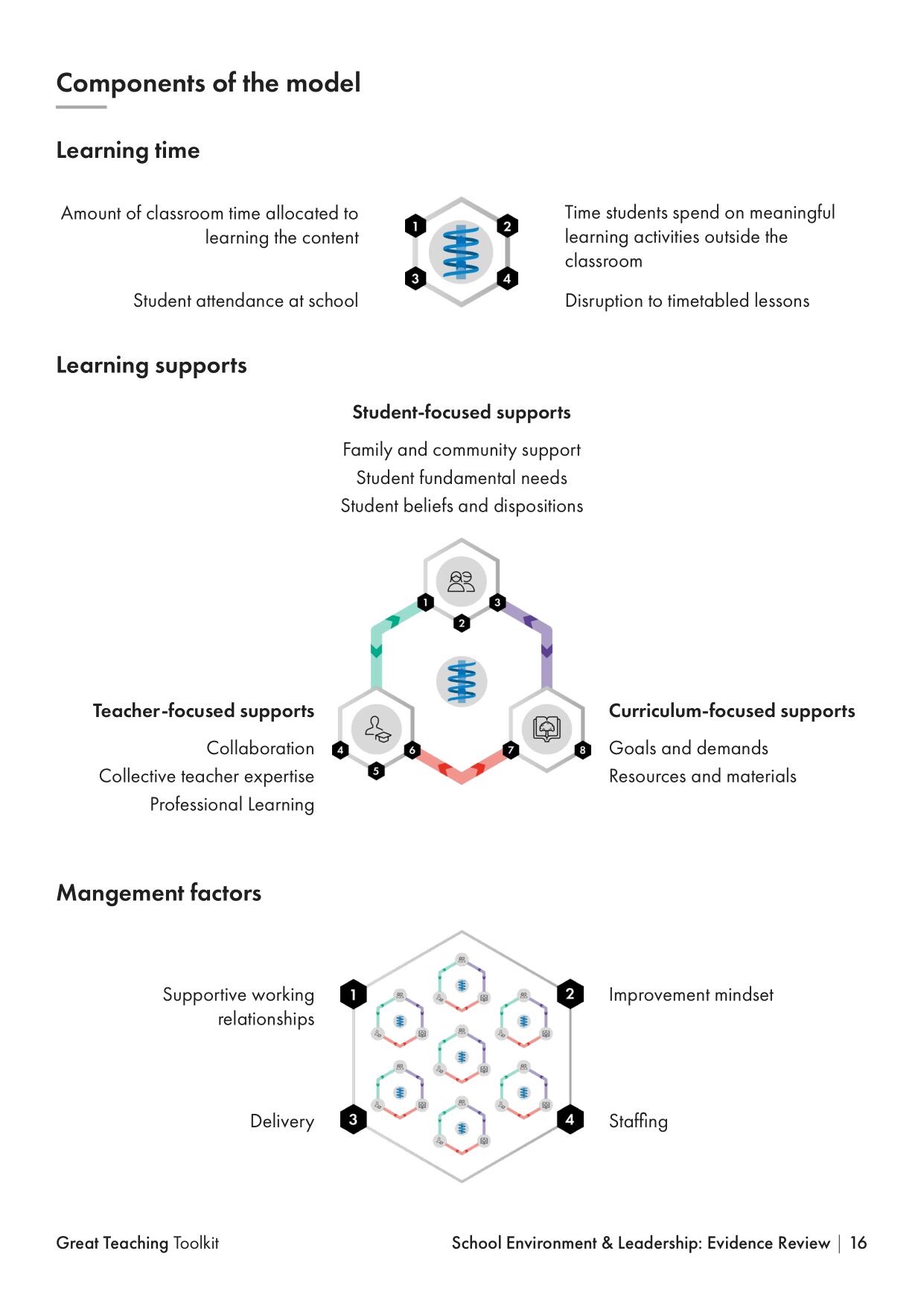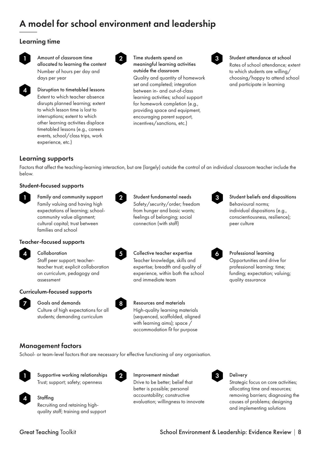 - Management Factors – School-level (or team-level) factors that are necessary for effective functioning of any organisation. On first reading these factors appear to be more generic leadership factors; applicable across many different varied organisations.