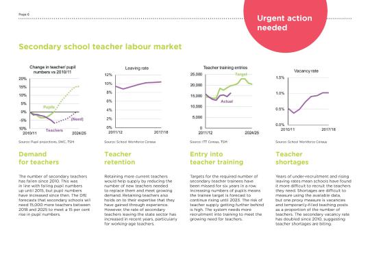 The DfE forecasts that secondary schools will need 15,000 more teachers between 2018 and 2025 to meet a 15 per cent rise in pupil numbers. Yet teacher numbers have been falling, due to increasing numbers of teachers leaving the state sector and insufficient numbers entering the secondary sector. The number of in-year vacancies and temporarily-filled posts, one measure of potential shortages, has doubled between 2010/11 and 2017/18.
