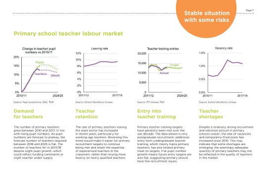 The DfE forecasts that primary schools will need to maintain teacher numbers over the next decade, by ensuring the numbers entering keep up with those leaving. However, the primary leaving rate has risen between 2011/12 and 2017/18 and the number of vacancies has increased, suggesting a risk of there being some supply challenges ahead.