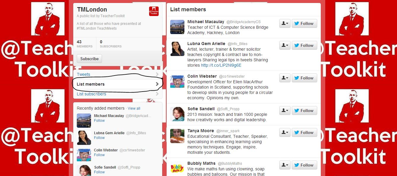 Another great one for teachers is @pedagoo. Ross McGill (@TeacherToolkit) suggested that it might be a good idea to look at some lists. This link is to @TeacherToolkit site and if you follow it then click on the “List Members” you will see a number of people who contribute to TeachMeet in London. Anyone you would be interested in following?