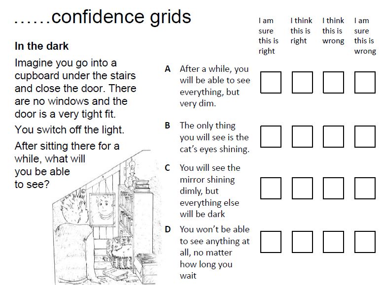 The question is focussed on a key scientific concept about how we see. It includes a common misconception students have about the source of light and its direction of travel. At a glance a teacher can see what a student is thinking and how secure their thinking is. I will look at the potential for using confidence grids as part of a class room assessment routine in the final post of this series: Pedagogy & Practice. The important thing to grasp at this point is: plan the assessments early in the planning process. They define the milestones and end points of each stage of the learning journey.